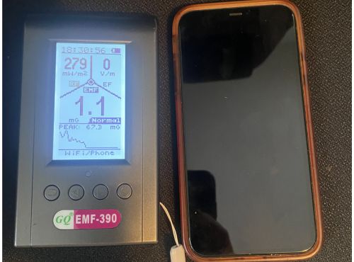 I ran a quick test with my phone to show how much the 390 can tell you about what your devices are actually doing. With cellular on I measured 675 mW/m².Switching to airplane mode with WiFi still on brought it down to 406 mW/m². True airplane mode with everything off dropped it to 0.00 mW/m². That sequence tells you something useful: airplane mode with WiFi enabled is not the same as full airplane mode, and the difference on the meter is significant.