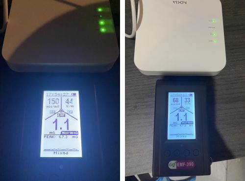 This is where the 390 showed me something I didn’t expect. I measured 68 mW/m² right next to the router, then took another reading at the same spot less than a minute later and got 150 mW/m². Same position, same router, big difference. That’s not the meter being inconsistent. That’s the router itself pulsing, and the 390 is catching it in real time.