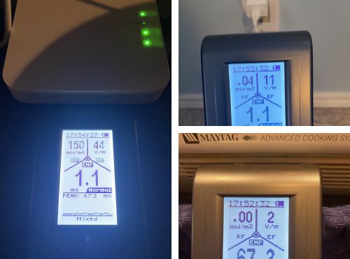 Outside the room about eight feet away, the reading dropped to 0.0 mW/m². The RF essentially disappeared as soon as I left the room.