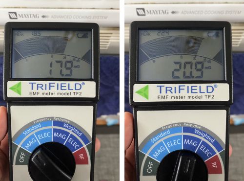 Right next to the stove, practically touching it, I measured 67.3 mG and 2 V/m. About a foot back that dropped to 5.3 mG and 1 V/m. At two feet back I was down to 2.1 mG and 1 V/m. That’s a pattern you’ll see with almost every large appliance: the field drops off quickly with distance. Two feet cut the magnetic field reading by about 97% compared to right at the surface.