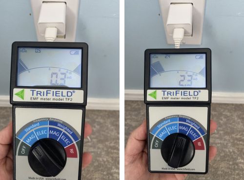 Right next to the charger I measured 116 V/m. About a foot away that fell to 11 V/m. Phone chargers are one of the more surprising sources of electric field in a typical bedroom, especially if yours sits on the nightstand while you sleep.